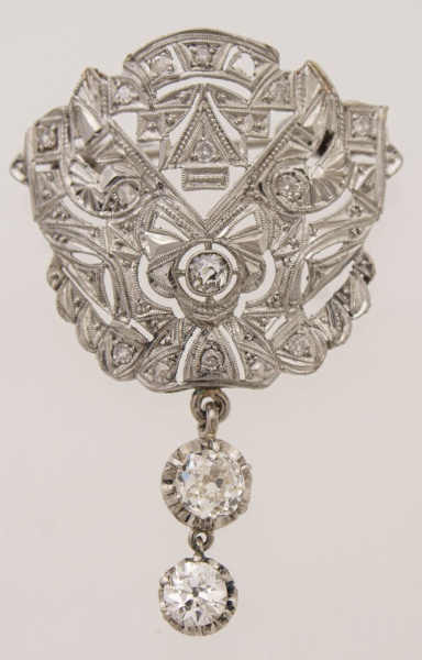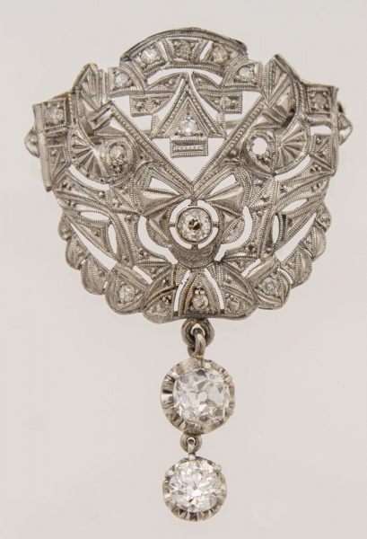 • Belíssimo broche art deco cerca de 1930 em platina cravejado com brilhantes, ricamente cinzelado e vazado com pingente na parte central com dois brilhantes sendo um de aproximadamente 0,25 ct (o menor) e 0,50 ct ( o maior) - broche - med. 3x4,3 cm - peso aproximado - 6,1 gr (falta um pequeno brilhante na parte superior) - ESTE LOTE SOMENTE PODERÁ SER RETIRADO COM AGENDAMENTO PRÉVIO DE 48H DE ANTECEDÊNCIA, MEDIANTE CONFIRMAÇÃO DO PAGAMENTO, POIS NÃO SE ENCONTRAM NO LOCAL DE REALIZAÇÃO DO LEILÃO - este lote faz par com o lote 150
