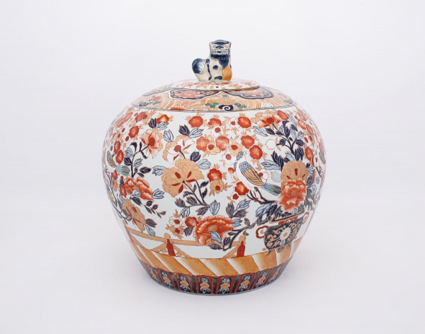 • Imari - Imponente potiche em porcelana Chinesa ricamente policromado e esmaltado nos tons de azul cobalto, " rouge de fer " sobre fundo branco, pega da tampa decorado com cão de fó, assinado na base - med. 42x25 cm de diâmetro da base