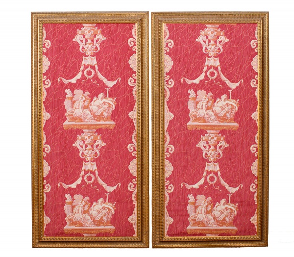 • Elegante par de painéis decorativos retangulares emoldurados com tecidos europeus no estilo de panôs decorados com cenas mitológicas com Ninfas e Deusas, fundo no tom bordô, moldura em madeira entalhada com pátina a folha de ouro - med. 158x80 cm