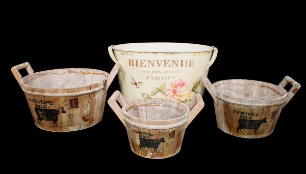 • Lote com três peças decorativas sendo três cestos Fazenda Rústica em madeira decorados com " vacas " com as inscrições " Farm Fresh Milk " parte interna revestida com plástico para proteção da madeira - med. 15,5x26x19 cm (o menor) - med. 17x31x25 cm (o médio) e med. 19,5x37x30 cm (o maior), o maior está com defeitos nas alças e floreira com alças laterais em metal decorado em decape com flores, folhagens e borboletas com as inscrições " Bienvenue sur mon petit - jardin " - med. 25x42x28,5 cm (com amassados)