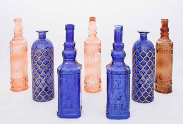 • Lote constando de sete garrafas decorativas em vidro moldado em diversos formatos e tamanhos, garrafas pintadas em cores diversas, um par - med. 27 cm, um par - med. 30 cm, um par - med. 31 cm e uma - med. 31 cm (duas com desgastes na pintura)