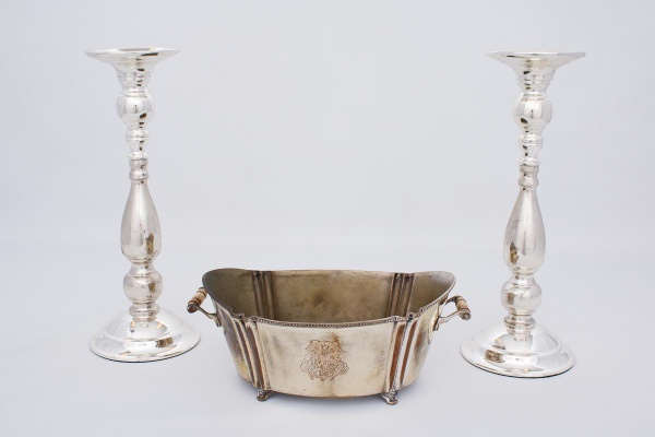 • Lote constando de três peças sendo um elegante centro de mesa estilo inglês em metal espessurado a prata com borda recortada e perolada, alças laterais, parte inferior com monogramas, apoiada sobre quatro pés - med. 12x31x17 cm ( com desgastes no banho de prata), e um par de castiçais estilo inglês em metal com bases redondas - med. 36x13 cm de diâmetro na base ( com desgastes no banho)