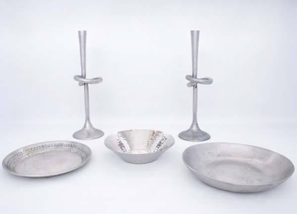 • Lote constando de cinco peças decorativas diversas sendo um par de castiçais estilo contemporâneos em metal prateado fosco - med. 46x14 cm de diâmetro de base (os dois com amassados na parte central, desgastes na pátina), um centro de mesa - fruteira no estilo contemporâneo em metal prateado - med. 5x33 cm (com desgastes de uso na pátina) e uma fruteira e uma bandeja redonda em metal Indiano martelado - fruteira - med. 7x25,5 cm de diâmetro e bandeja - med. 3x30 cm de diâmetro (bandeja com desgastes de uso)