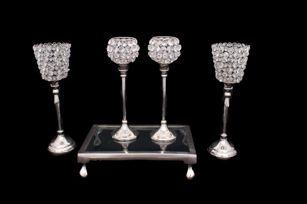 • Lote constando de cinco peças decorativas diversas sendo uma bandeja retangular em metal prateado com fundo em vidro, apoiada sobre quatro pés - med. 8x30x20 cm (com pequenos desgastes de maresia no metal) e dois pares de castiçais em formas e tamanhos diferentes, parte superior com contas em acrílico, e hastes em metal prateados - med. 28x6 cm de diâmetro e 33x10 cm de diâmetro ( hastes com desgastes de maresia)