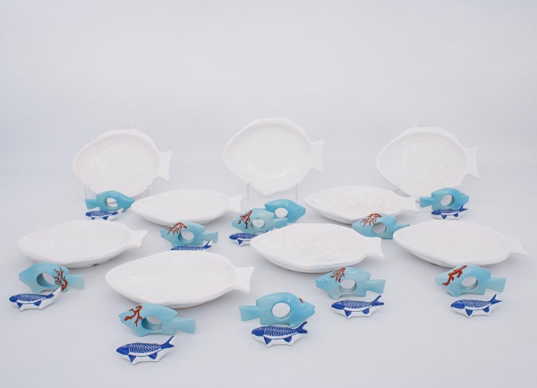 • Lote constando de vinte e nove peças em porcelana e cerâmica sendo nove suportes para talheres em porcelana nas cores azul e branco representando " peixes " - med. 2x7x4 cm, onze porta guardanapos em porcelana policromados representando " peixes " - med. 4,5x9,5x5 cm e nove pratos de sobremesa em faiança branca vitrificados na forma de " peixes " sendo um em modelo diferente - med. 3x21x16 cm ( alguns com craquele e seis com pequenos defeitos no vitrificado e dois com bicados nas nadadeiras caldal