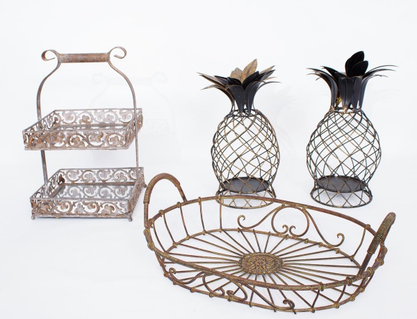 • Lote constando de quatro peças diversas em metal, sendo um par de peças decorativas na forma de " Abacaxis "com pátina no tom de ouro velho, bojos e bases vazadas - med. 29x13 cm de diâmetro na base (um deles falta uma folha na parte superior), uma fruteira em ferro forgê com alças laterais, com laterais e fundo vazados patinada - med. 13x39,5x29 cm e um porta doces em dois estágios com alça e galerias vazadas em metal , fundos espelhados apoiados sobre quatro pés - med. 34x20x20 cm (metal com desgastes  do uso e do tempo)