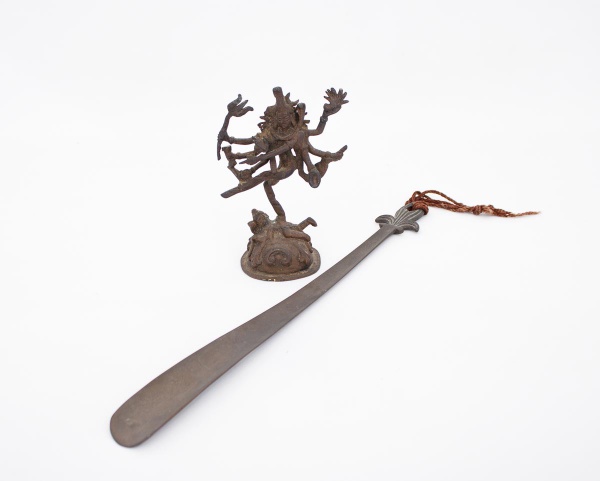 • Lote constando de duas peças em antigas em bronze diversas, sendo uma escultura Indiana cinzelada representando a divindade "Shiva" med. 16x11 cm e uma calçadeira europeia, cabo cinzelado com "flor de lis" med. 42x4 cm.