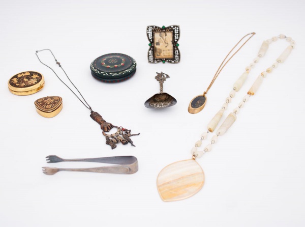 • Lote constando de diversas peças antigas, sendo um antigo colar Mexicano em pedra, pingente decorado com divindade med. 40x5 cm (fechado), um cordão com pingente Baiano cinzelado representando "figa com 5 berloques". Pingente med. 8,5x2 cm, cordão com pingente estilo contemporâneo em ágata com guarnição em metal dourado, pingente med. 4x1,3 cm, duas peças Espanholas de "Toledo" em metal dourado, sendo uma caixinha "porta pílulas", tampa decorada com brasão med. 3,5x3,5 cm e um espelho de bolsa, tampa decorada com flores e borboletas med. 4,7x5 cm, uma caixa europeia redonda em laca preta com decoração floral policromada med. 6,5 cm de diâmetro, uma miniatura de porta retrato em metal, moldura vazada com pedras verdes med. 5,5x4,5 cm e uma pinça para torrões de açúcar e uma colher para coleção em metal espessurado a prata med. 10,5x4 cm e 10,5x1,5 cm. total de 9 peças.