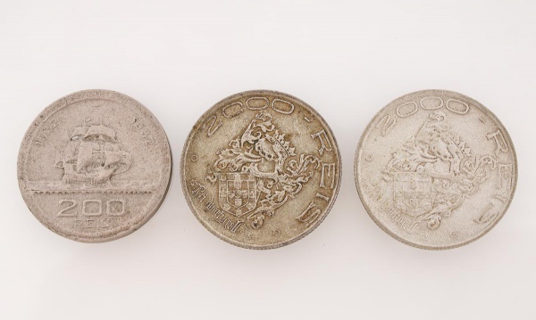 • Numismática - Moedas do Brasil - Três moedas Vicentinas comemorativas ao 4º centenário de São Vicente datadas de 1932, uma de 200 Reis (níquel) duas de 2000 Reis em prata - Total de 3 moedas