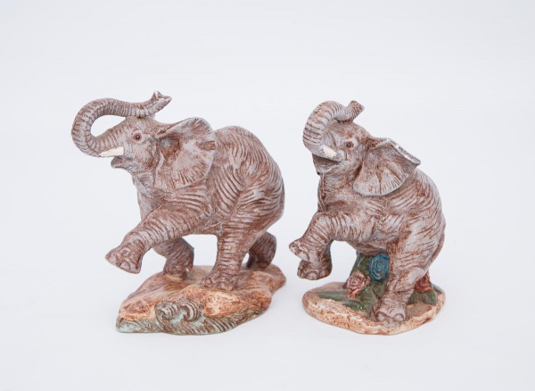 • Conjunto de esculturas europeias em biscuit policromados representando " elefantes " - med. 13x10x7 cm e 13,5x13x8 cm ( um com pequenos desgastes na policromia)