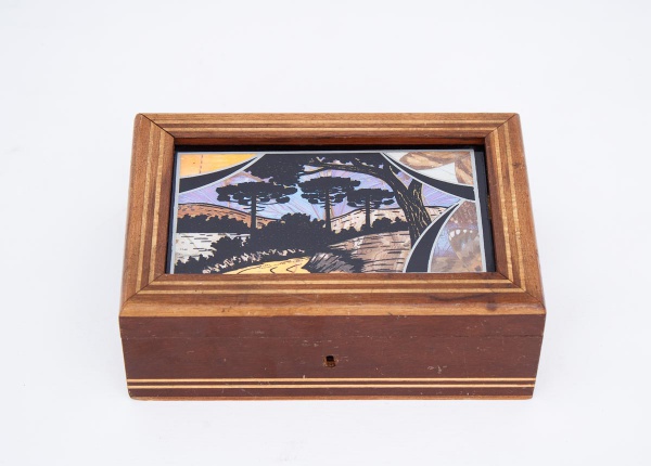 • Antiga caixa porta joias da década de 60 em madeira marchetada, tampa decorada com paisagem, pintura sobre vidro - med. 6,5x18x12,5 cm (madeira com pequenos desgastes no verniz)