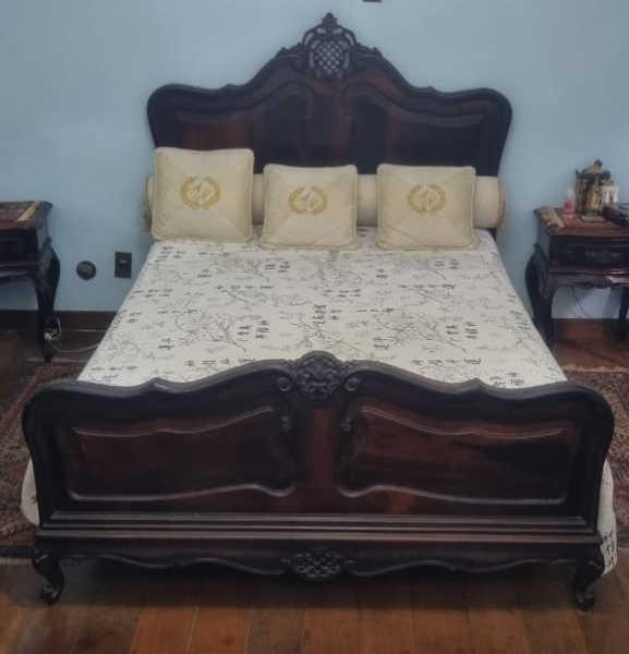 • Antiga cama de casal da década de 50 estilo Luiz XV em Jacarandá, encosto recortado encimado por florão vazado, pezeira recortada, pés cabriolê med. 145x210x155 cm (madeira com desgastes no verniz). Este lote faz conjunto com os lotes nº. Este lote não encontra-se no local do leilão, retirada com agendamento prévio em um condomínio na Barra.
