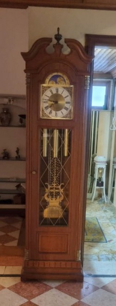 • Urgos - Relógio Carrilhão de chão, caixa em madeira clara, porta central com cristal bisotado, colunas laterais frisadas com guarnições em metal dourado, parte superior recortada com acabamento na forma de pinha em metal, parte interna com mostrador em metal com algarismos romanos, parte superior com fase da lua, pesos e pêndulos em metal dourado, base recortada med. 217x59x28 cm (parte superior da porta com pequenos desgastes na placagem - relógio funcionando no momento sem garantia futura). Este lote não encontra-se no local do leilão, retirada com agendamento prévio em um condomínio na Barra.
