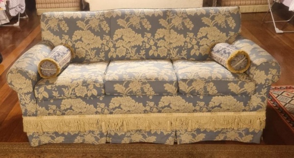 • Antigo sofá para três lugares estofado em tecido no tom azul com decoração floral, assento com almofadas soltas, tecido usado, mas em bom estado. Base decorada com franjas med. 90x200x95 cm. Este lote não encontra-se no leilão precisando de agendamento prévio para retirada em condomínio na Barra.