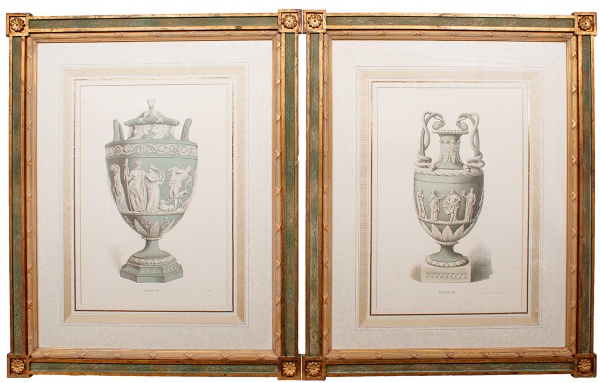 • Par de gravuras decorativas decoradas com vasos Greco Romanos, moldura em madeira patinada com realces á folha de ouro med. 46x32 cm, com moldura med. 76x62 cm (paspatús e papéis com manchas do tempo). Este lote não pode ser enviado pelos Correios.