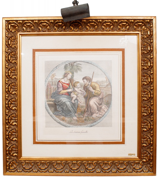 • Antiga gravura francesa colorida representando A Sagrada Família (La Sainte Famille), moldura em madeira com pátina à folha de ouro med. 50x48 cm, com moldura med. 95x91 cm (papel e paspatú com manchas do tempo), acompanha luminária em metal na parte superior do quadro. Este lote não pode ser enviado pelos Correios.