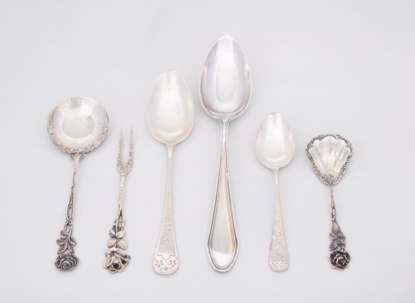 • Lote constando de 6 antigos talheres em prata de lei diversos modelos contrastados, teor 800 mile, sendo 1 colher de sopa. 1 colher de sobremesa, 1 colher de chá e três talheres do mesmo conjunto para serviço, peso total aproximado 180 gr.