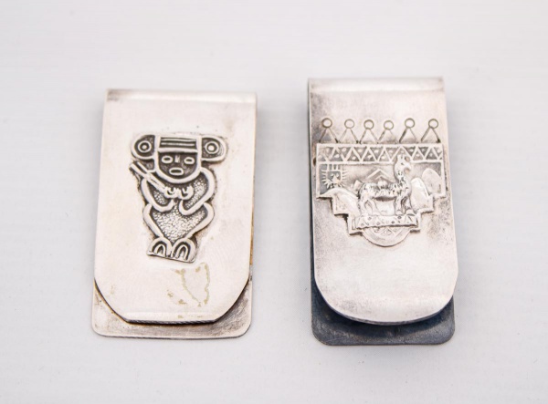 • Lote com dois antigos clipes para cédulas em prata Colombiana, sendo um cinzelado com divindade contrastado 900 mile, med. 2,5x4 cm e outro cinzelado com "lhama" contrastado 925 mile, med. 2,2x4,5 cm, peso total aproximado 29.3 gr.