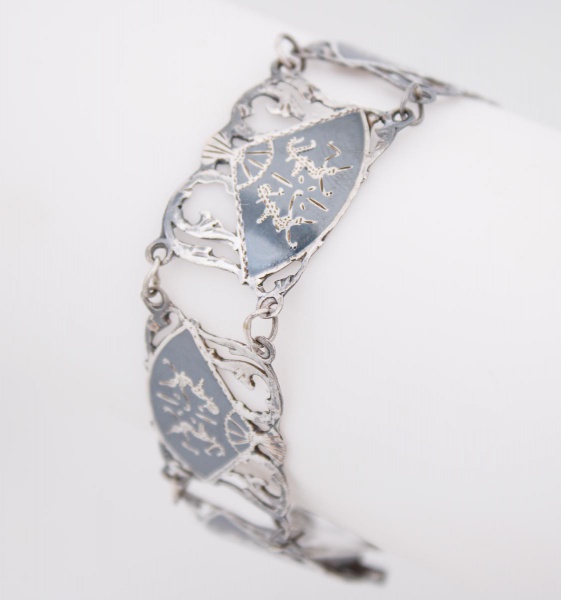 • Antiga pulseira Tailandesa em prata de lei contrastada, cinzelada com leques decorados com divindades med. 17,5x1,7 cm, peso aproximado 13.7 gr.