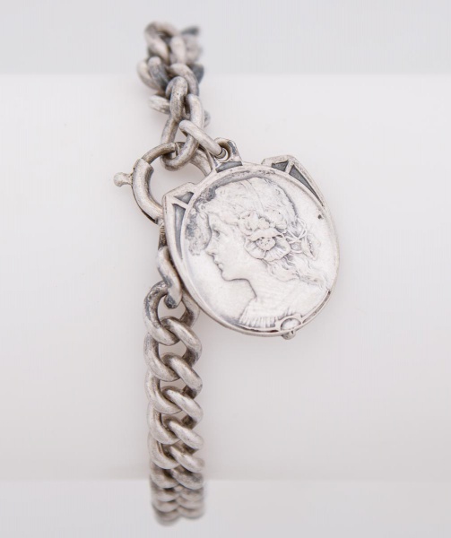 • Antiga pulseira em prata de lei com elos entrelaçados. acompanha medalha art. noveau cerca de 1900 cinzelada com rosto feminino contrastada teor 800 mile, pulseira med. 18,5 cm (aberta) e medalha med. 1,5x2 cm, peso total aproximado 20.4 gr.