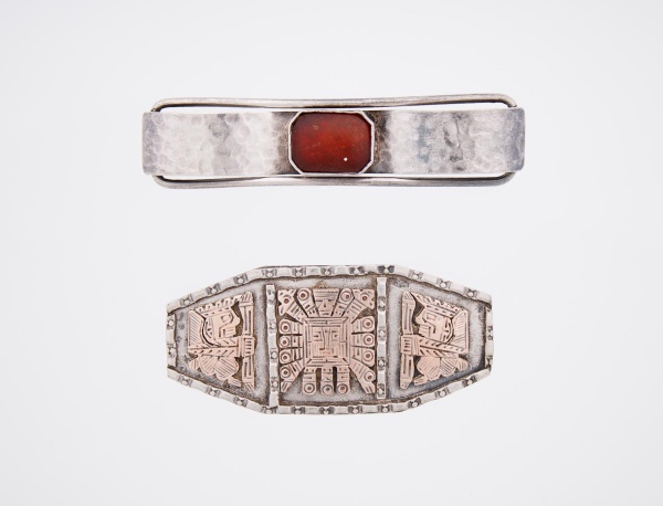 • Lote constando de dois antigos broches em prata de lei, sendo um art. deco com pedra central no tom castanho, contrastado teor 900 mile med. 5,8x1,3 cm e um broche Mexicano em prata e ouro cinzelado com divindades med. 5x2,2 cm, peso bruto total aproximado 16.1 gr.