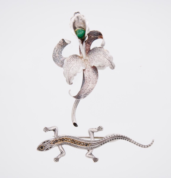 • Lote constando de dois antigos broches em prata de lei, sendo um Português cinzelado na forma de "salamandra" cravejado com marcasitas med. 5,5x1,5 cm e outro cinzelado na forma de "orquídea" com uma pequena pedra verde no interior med, 5,3x3 cm, peso total aproximado 7.1 gr.