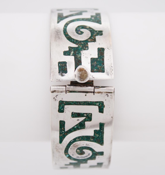 • Antiga pulseira Mexicana em prata com esmalte no tom verde contrastada med. 17x2,2 cm, peso aproximado 28 gr.