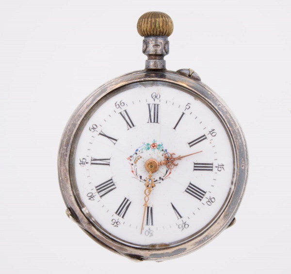 • Antigo relógio de bolso feminino europeu cerca de 1900, mostrador em esmalte com decoração floral com algarismos romanos, capa cinzelada com volutas em prata contrastada 800 mile, med. 4,3x3,2 cm (mostrador com fios de cabelo, falta a argola da "coroa", capas com pequenos amassados) máquina sem garantia de funcionamento, peso bruto aproximado 28 gr.