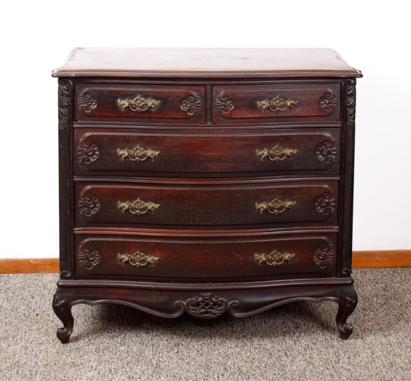 • Antiga cômoda da década de 50 estilo Luis XV em Jacarandá e madeira nobre entalhada. Tampo retangular recortado e folheado com duas gavetas e três gavetões com puxadores em bronze cinzelado, saia inferior recortada, pés cabriolê med. 100x110x60 cm (tampo com defeitos na placagem, manchas e desgastes no verniz, uma lateral com desgastes no verniz). Tampo precisando ser restaurado, este lote faz conjunto com os lotes nº.