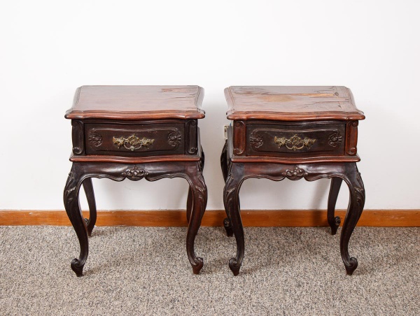 • Par de antigas mesas de cabeceira da década de 50 estilo Luiz XV em Jacarandá entalhado, tampos recortados e folheados com uma gaveta central com puxadores em bronze cinzelado, saias recortadas, pernas curvas, pés cabriolê med. 63x50x40 cm (tampos com defeitos na placagem, mesas com desgastes no verniz, precisando ser restaurados os tampos). Este lote faz conjunto com os lotes nº.