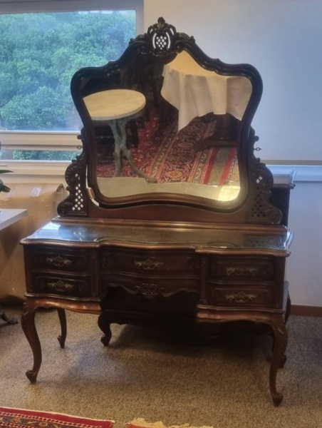 • Antiga penteadeira da década de 50 estilo Luiz XV em Jacarandá e madeira nobre, tampo retangular recortado com um espelho na parte superior do tampo, parte superior com espelho recortado encimado por florão, laterais entalhadas e vazadas com parafusos de bronze para fixar o espelho, parte inferior com uma gaveta central e quatro gavetas laterais com puxadores em bronze cinzelados, saia recortada, pernas curvas, pés cabriolê med. 170x133x47 cm (espelho do tampo com desgastes de uso e do tempo e madeira com pequenos desgastes no verniz). Este lote faz conjunto com os nº.