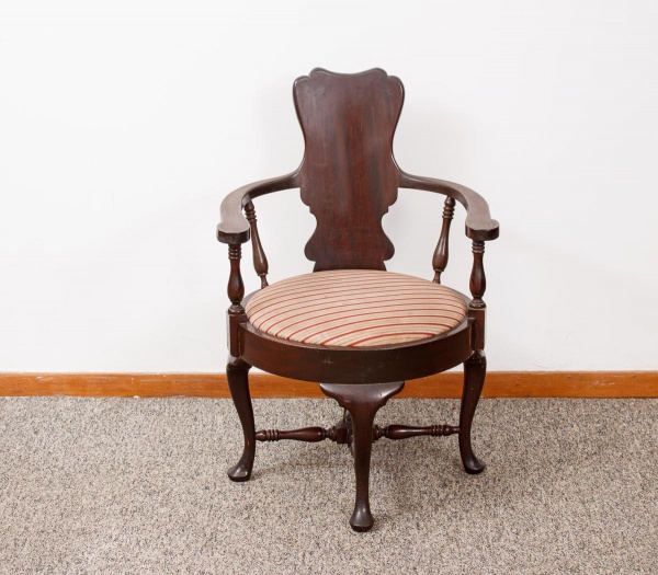 • Antiga cadeira em madeira nobre torneada, encosto recortado com braços curvos com traves laterais torneadas, assento estofado em tecido listrado, quatro pernas curvas com amarração central torneada med. 90x62x55 cm (madeira com desgastes no verniz, tecido com desgastes).