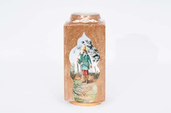• Antigo vaso em porcelana policromado da manufatura "Saler", decorado com paisagens e figuras masculinas com realces á folha de ouro, marca da manufatura na base med. 26x9 cm de borda.