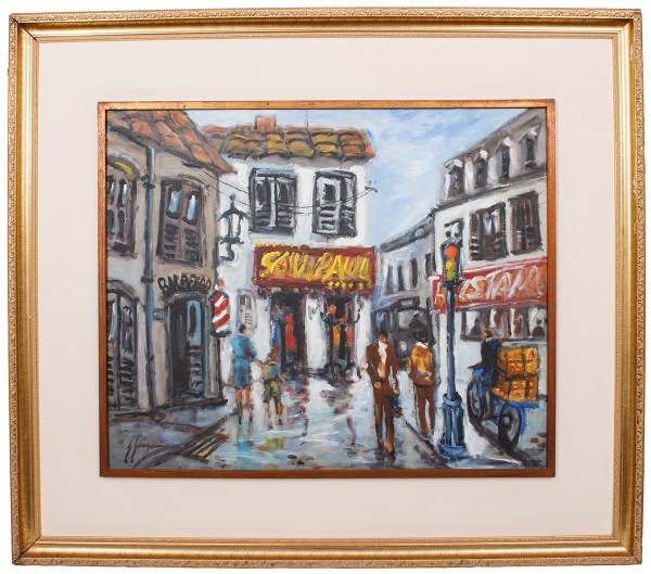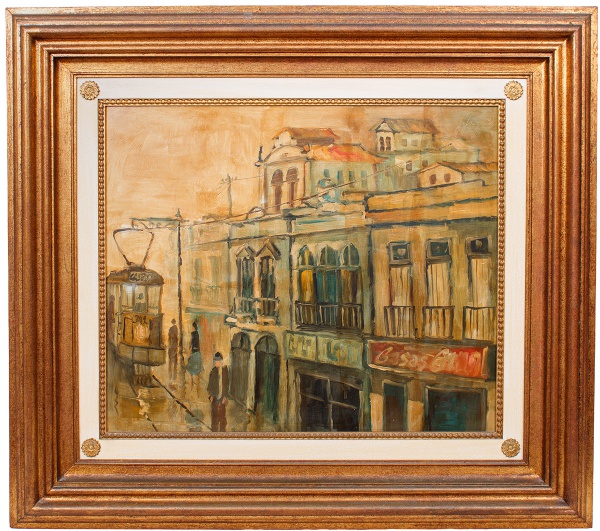 • J. Longuinõ - Casario com bonde - o.s.e - ass. C.S.D, med. 46x55 cm, com moldura med. 72x81 cm.