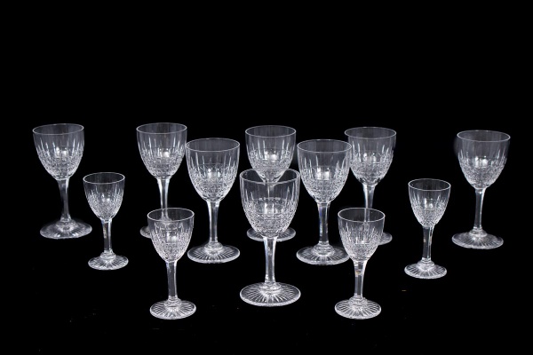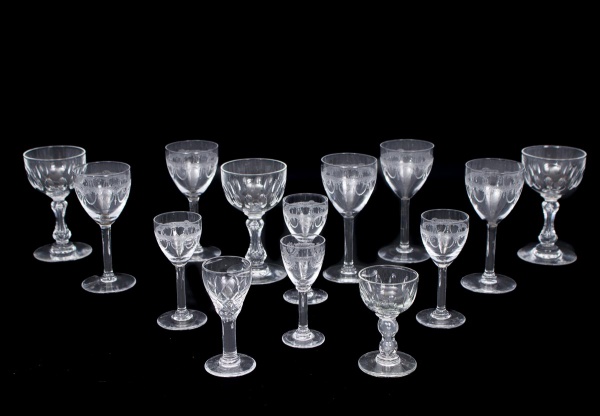• Lote constando de catorze copos em cristal europeu diversos sendo cinco cálices para vinho do porto em cristal Fratelevita  - Bahia com decoração lavrada decorados com guirlandas - med. 12x5 cm de diâmetro, três cálices de licor do mesmo conjunto - med. 10x4 cm de diâmetro, três cálices para vinho do porto com lapidação dita " dedão " hastes facetadas - med. 11x6 cm de diâmetro, um cálice para licor do mesmo modelo - med. 8x5 cm de diâmetro, e dois cálices para licor de modelos diferentes - med. 9x4 cm de diâmetro