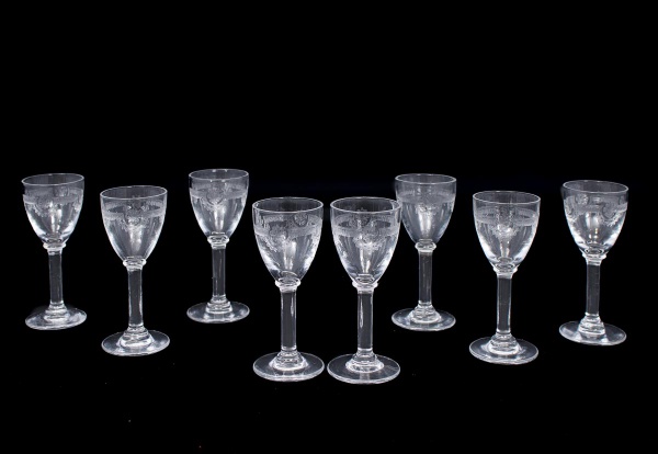 • Fratelevita - antigo conjunto de oito cálices para licor em cristal da manufatura Fratelevita - Bahia, bordas lavradas com guirlandas - med. 9x4 cm de diâmetro