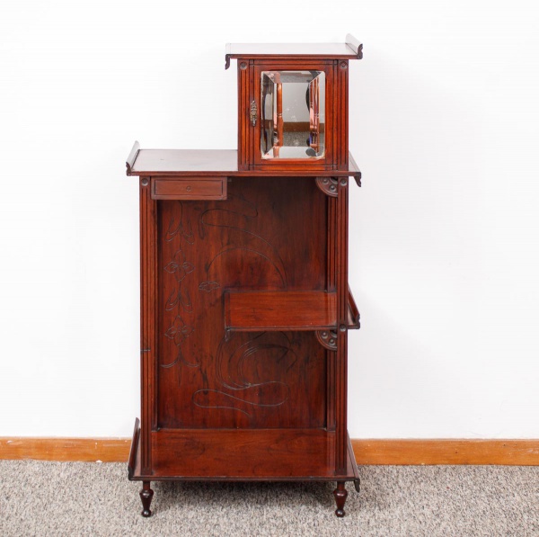 • Antigo móvel porta Bibelô art nouveau cerca de 1920 em madeira, parte superior com porta em cristal bisotado e puxador em bronze cinzelado, tampo com uma gaveta lateral, parte inferior com fundo decorado com flores e folhagens, pernas retas com duas prateleiras, pés torneados - med. 124x60x32 cm (espelho com pequenos desgastes do tempo e madeira com pequenos desgastes no verniz)