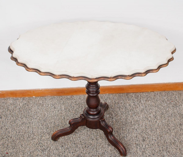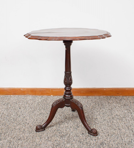 • Antiga mesa auxiliar  - gueridon - em madeira nobre, tampo redondo recortado, coluna central torneada e entalhada apoiada sobre três pernas curvas com pés de garras - med. 62x54 cm de diâmetro, tampo feito em duas partes (tampo com manchas e desgastes no verniz)