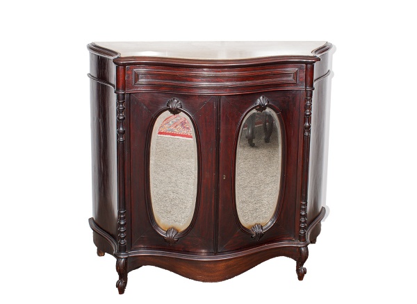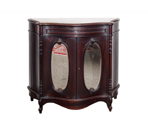 • Antigo Dunquerque estilo colonial bombé cerca de 1900 em madeira envernizada, tampo recortado em mármore branco rajado com uma gaveta central com duas portas centrais com espelhos em cristal bisotado, parte interna com duas divisórias, laterais com colunas torneadas, saia recortada e pés cabriole - med. 100x100x40 cm (tampo de mármore com pequenos bicados no fundo, uma lateral do fundo com vestígios de ter tido cupim, precisando ser restaurado, espelhos com pequenos desgastes do tempo)