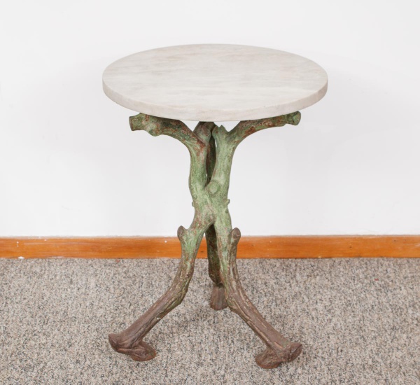 • Antiga mesa auxiliar com tampo redondo em mármore branco rajado, base em ferro forgê patinado no formato de tronco de árvores, pés curvos - med. 74x56 cm de diâmetro (tampo com pequenos bicados na borda)