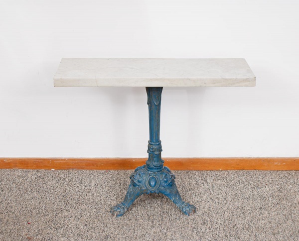 • Antigo console com tampo retangular em mármore branco rajado, coluna e base em ferro forgê com pátina na cor azul, base decorada com rostos masculinos, apoiada sobre três pés de garras - med. 70x88x30 cm (tampo com bicados na borda)