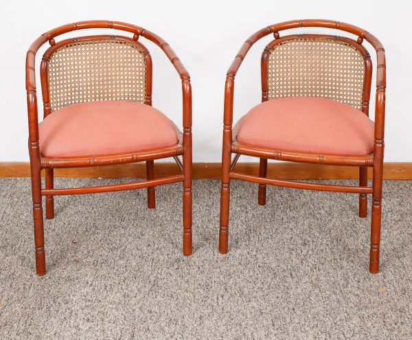 • Par de cadeiras da década de 80 em madeira clara torneada na forma de "bambus", encostos em palhinha Indiana, assentos estofados em tecido no tom coral med.73x54x48 cm (cadeiras precisando de ajustes de cola e tecidos com desgastes de uso).