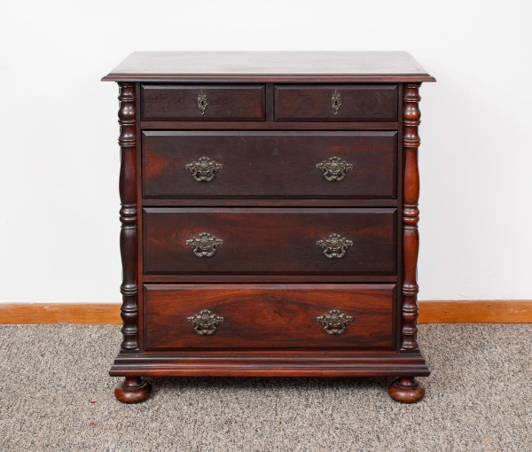 • Antiga cômoda de madeira nobre e Jacarandá, tampo retangular, com duas gavetas e três gavetões, laterais com colunas torneadas, pés dito "bolachas" med. 90x87x47 cm.