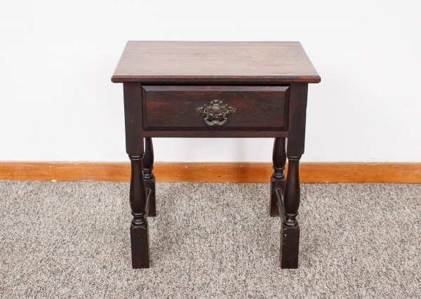 • Antiga mesa de cabeceira em madeira nobre e Jacarandá, tampo retangular com uma gaveta central com puxador em bronze cinzelado, pernas torneadas com traves laterais med. 55x50x38 cm (tampo com desgastes e manchas no verniz).
