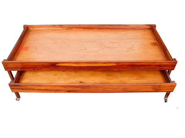 • Bicama da década de 60 adquirida na loja "Oca", estrutura em Jacarandá com acabamentos laterais em madeira, pernas retas, à cama inferior com rodízios nas pernas med. 46x83x187 cm e a inferior med. 32x83x174 cm (com pequenos desgastes no verniz, não acompanha colchões).
