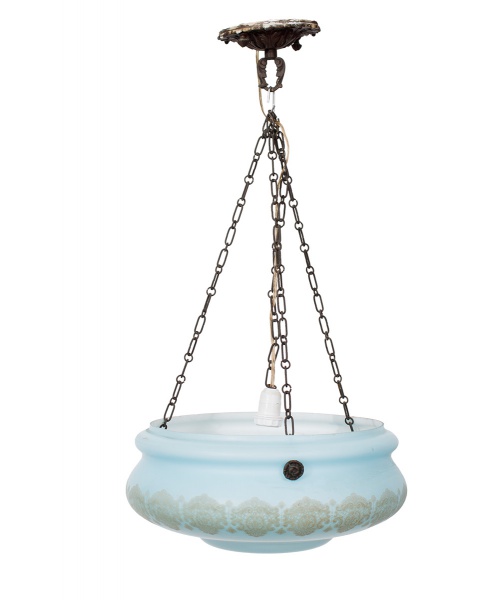• Antigo plafon de teto cerca de 1930 para uma lâmpada em vidro opalinado no tom azul Turquesa, parte interna no tom branco, bojo decorado com arabescos policromados. Plafon med. 18x38 de diâmetro, medida com corrente 65 cm de altura (com pequeno bicado na borda).