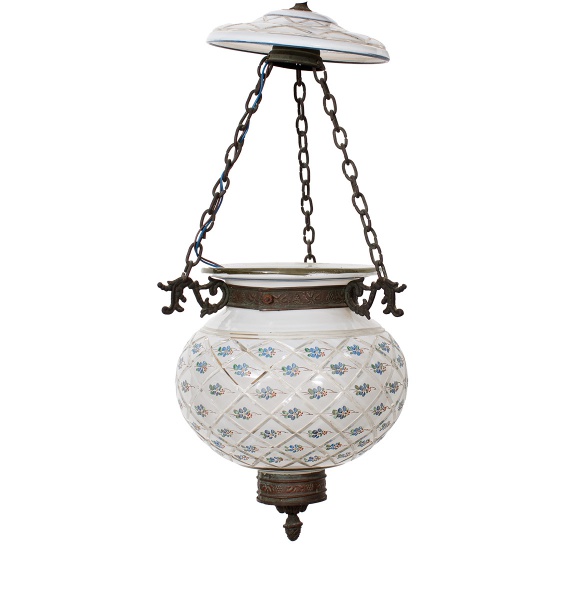 • Antiga lanterna de teto para uma lâmpada em cristal de overlay lapidado no tom branco com decoração floral policromada, acompanha espelho do teto em overlay med. 60x23 cm de diâmetro, parte elétrica funcionando.