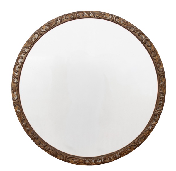 • Antigo espelho redondo com moldura em bronze patinado cinzelado com arabescos e folhagens med. 50 cm de diâmetro. este lote não pode ser enviado pelos Correios.