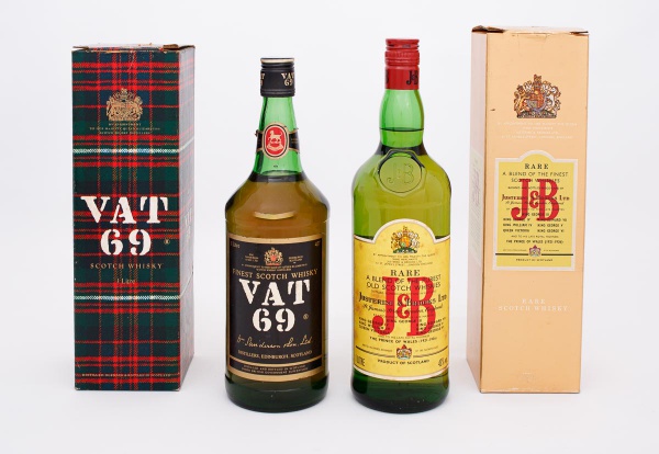 • Bebidas - Lote constando de duas garrafas de whisky sendo uma " J e B - Justerine e Brooks " - England - 1 litro lacrada acondicionada em caixa original e uma " Vat 69 " 1 litro lacrada acondicionada em caixa original (sem garantia do líquido)