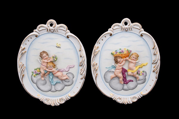 • Par de antigas placas alemães em biscuit policromado cerca de 1940, medalhões centrais decorados com querubins com flores sobre nuvens, bordas decoradas com realces a folha de ouro, marca da manufatura na base - med. 24x19 cm